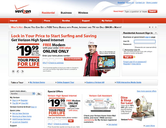 赤色是Verizon的公司品牌主色彩,也是贯穿整个网站的色彩。赤色有助于影响用户的振奋性,展现出一个出售让人振奋和疾速更新的产物的公司形象。白色布景的运用与亚马逊相似,经过一个整齐有序的界面来协助用户阅览这个网站。