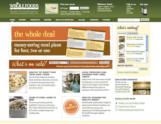 全食食物公司品牌的主色彩和他们的网站色彩相同,是绿色。全食食物以较高的价钱售卖安康的有机食物。网页描绘中的绿色很好的展现了他们所珍爱的安康与纯洁的概念,以及他们接近天然的产物。他们也用了很配绿色的淡黄色作为强调色,为网站增添了兴趣性。