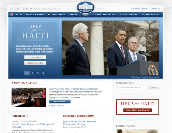 白宫的网站首要是白色和浅灰色,再加上一些蓝色和赤色作强调色。白色标志着期望和自在,显露出平安和纯真的价值。赤色和蓝色当然是美国的代表色,赤色代表着热心和能量,蓝色则代表着安稳与平缓。