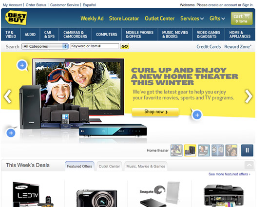 百思买的网站的色彩是深蓝色,显露出他们在电子市场中的安稳和实力。顾客在百思买上的很多收购使得他们需求安全感与平缓感。黄色发出的高兴气氛让他们在收购时感触到振奋与兴趣。