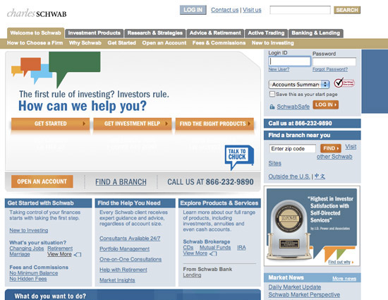 嘉信理财是一家投资公司,在不安稳的市场环境下他们需求让消费者在他们的网站上感触到平缓。他们运用柔软的深蓝色彩来完成这一点,并建立起一种安静、吉祥的气氛。中性的棕色则是另一种协助和谐过火的用户感触的公司色彩。橙色作为强调色,能让用户在买证券时发生振奋感,一同也为网站带来了美好感。